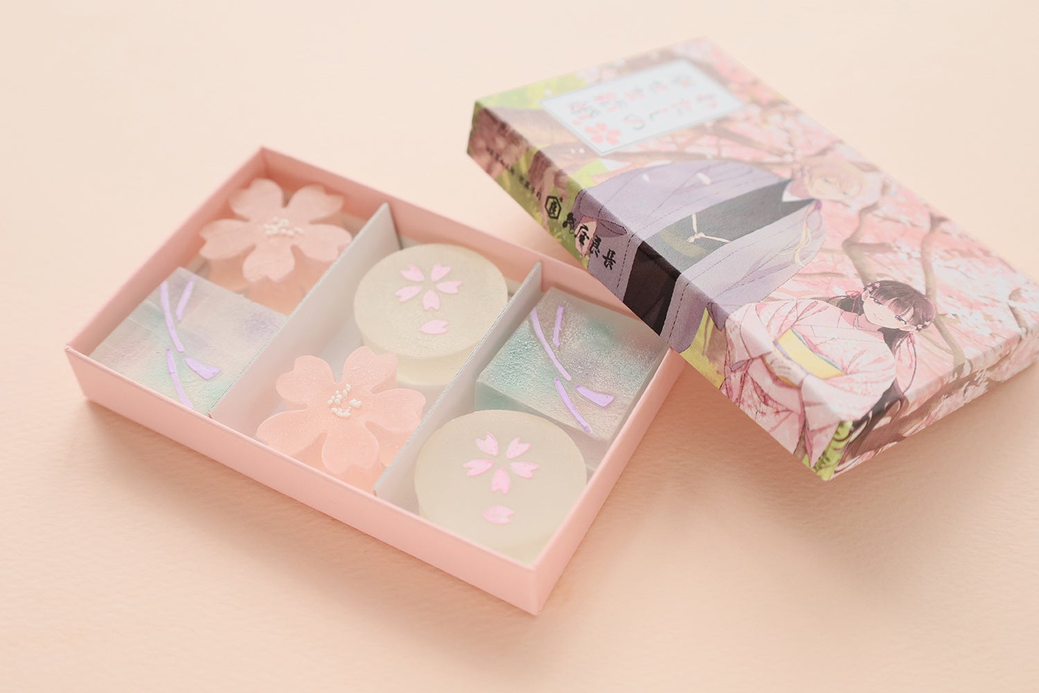 上品な甘さと、しゃりっとした食感がたのしい琥珀糖は、職人が一つ一つ手づくりによるもの。桜景色と2人の着物姿を描いた小箱にお詰めしております。