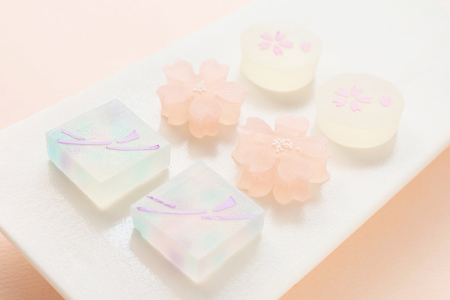 美世の着物をイメージした2種類のさくらと、清霞の組紐を描いた琥珀糖です。