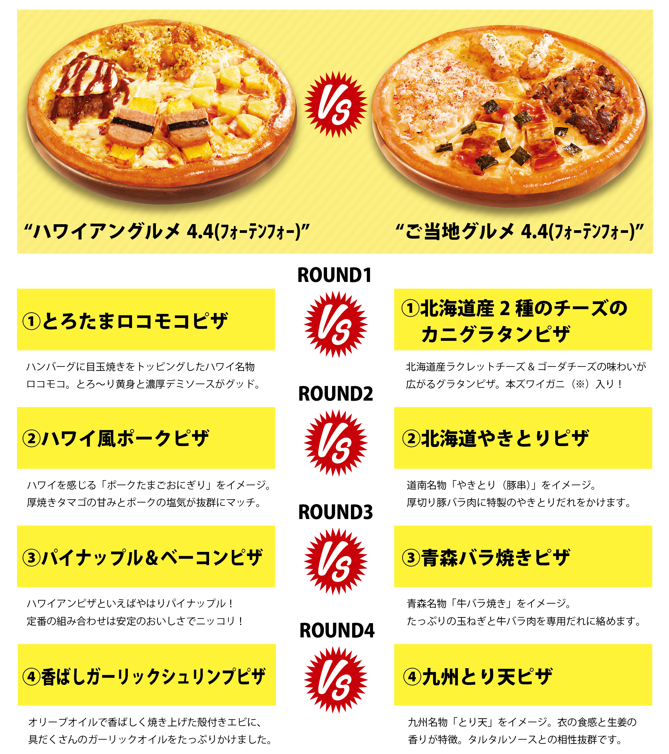 北海道発!宅配ピザ「テンフォー」を運営する株式会社テンフォー (本社・北海道函館市/代表・髙橋仁志)からこの年末、ハワイのごちそうが大集合した“ハワイアングルメ4.4(フォーテンフォー)”が新登場!!日本のご当地グルメづくしの“ご当地グルメ4.4(フォーテンフォー)”とのグルメピザ対決が実現しました!