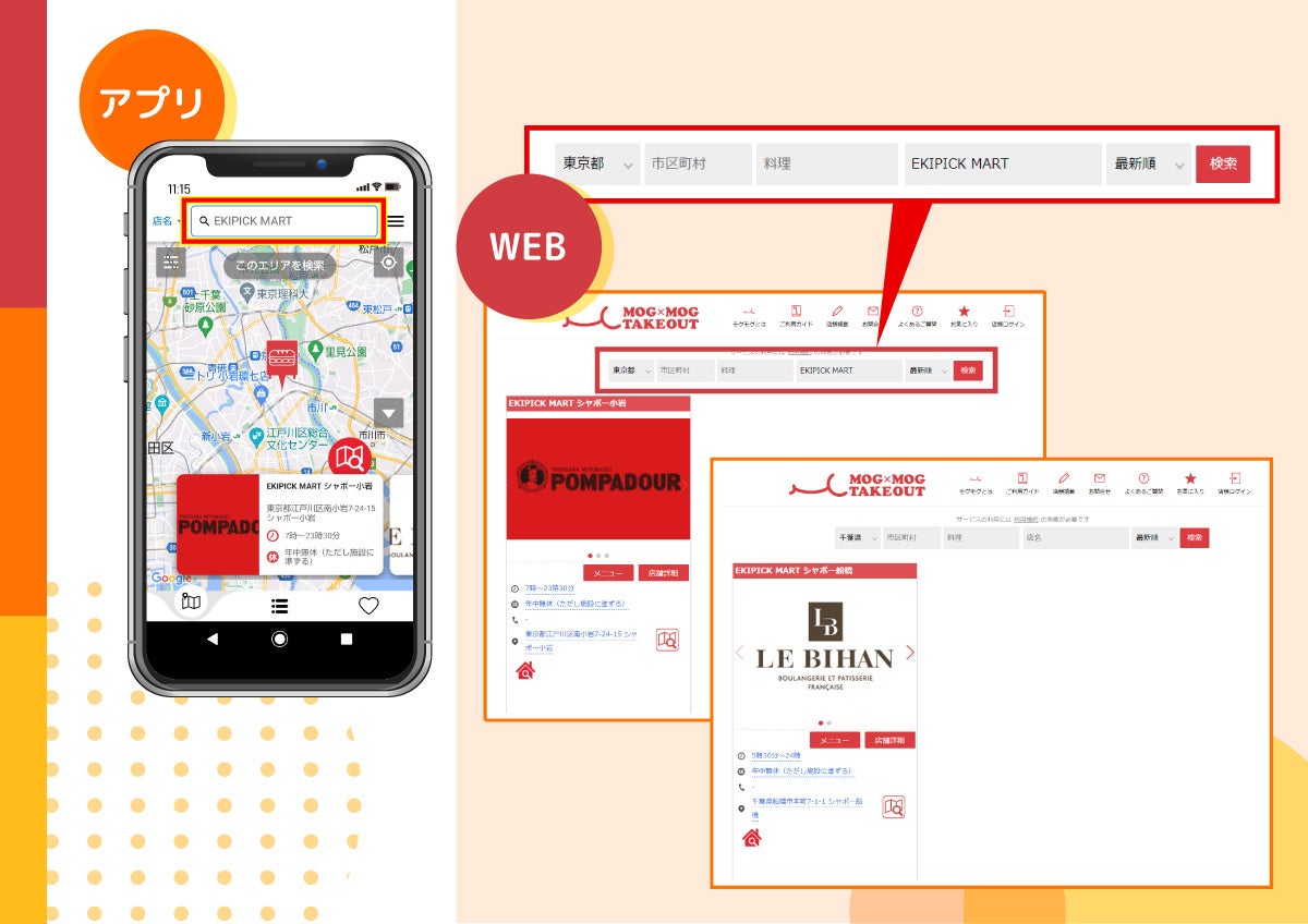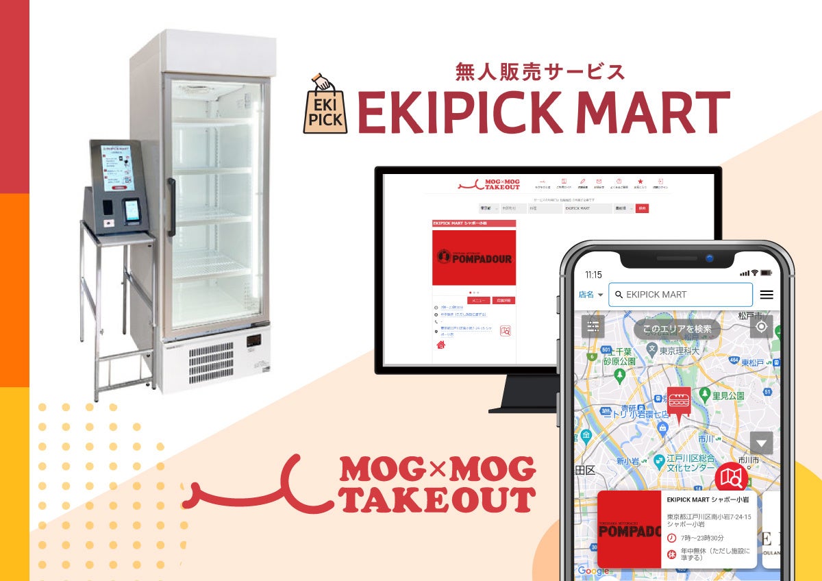 駅ビルの営業時間外も購入できる無人販売「EKIPICK MART」× 無人販売店を探せるアプリ「モグモグテイクアウト」