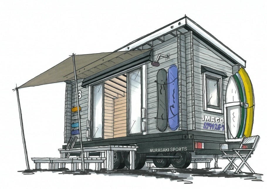 “IMAGO”はBESSが2021年10月に新発売した車輪付きログ小屋商品。ムラサキスポーツ特別仕様車は、自分の好きなものばかりを詰め込める「おもちゃ箱」、ムラサキスポーツの魅力的なアイテム群を象徴する「道具箱」、ワクワクする驚きが詰まった「びっくり箱」の3つの要素を掛け合わせたデザイン。「GRAY × WHITE」のカラーでムラサキスポーツのロゴが入ります。夏はサーフボードを置いたりウェットスーツを干したりもできるカフェスペースとして利用し、冬は山に移動してスノーボードのライダーハウスとして活用することを想定し、内外の壁面には、サーフボードやスケートボードのラックや、シャワーを設置し、ムラサキスポーツが応援するライドスポーツに活用でき、シーンに応じて自由に手を入れることができる仕様となっています。