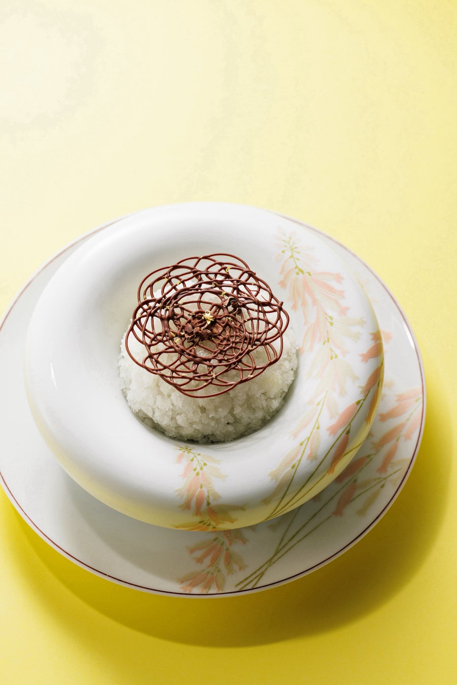 レースのようなショコラをまとった爽やかなユズのグラニテ。その下には滑らかなショコラのクリーム、ショコラのビスキュイ、フレッシュオレンジ、ライム、ザクザクとしたヘーゼルナッツのショコラなど、甘酸っぱくほろ苦い柑橘とショコラの組合せをご堪能いただけます。