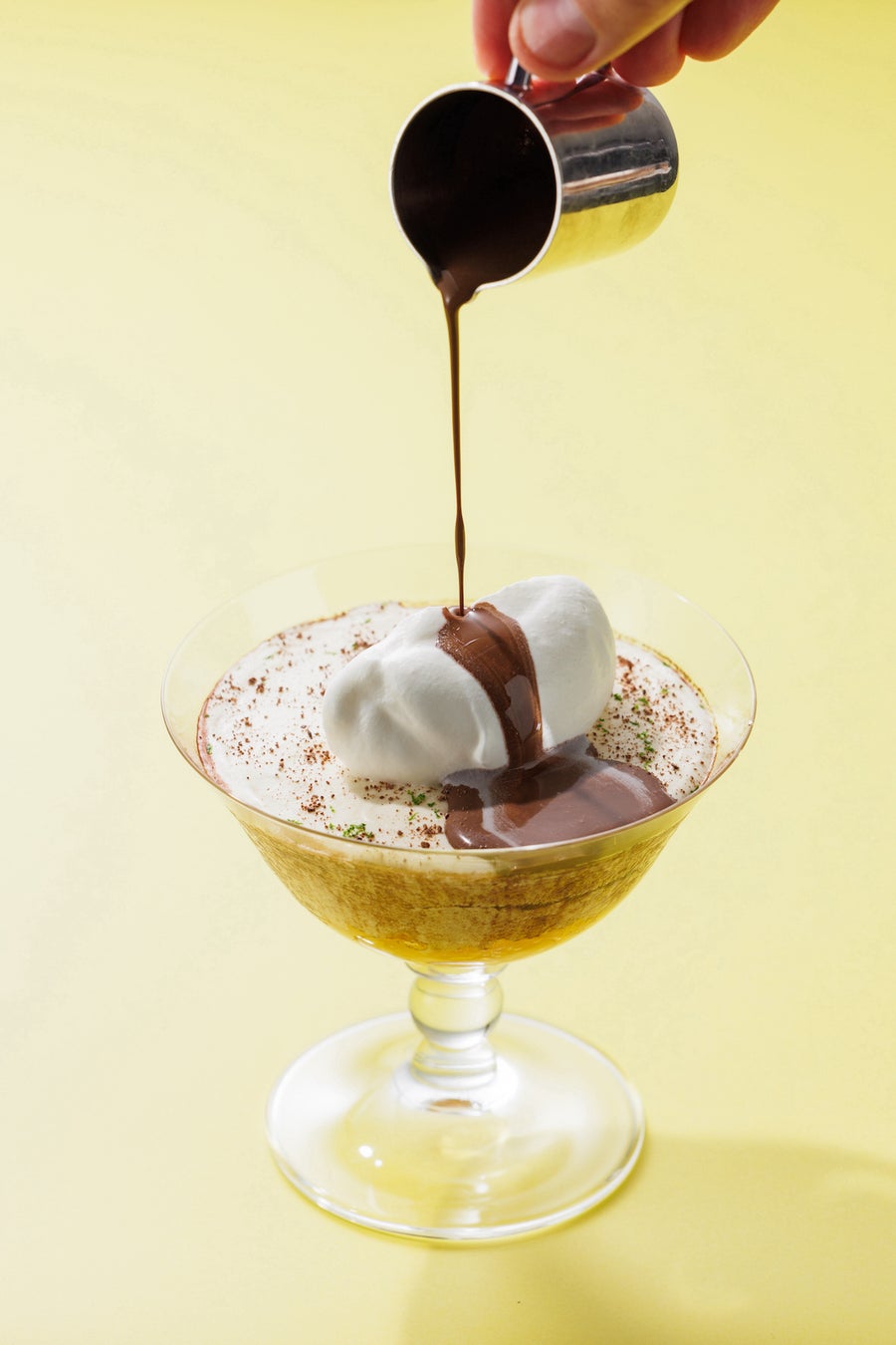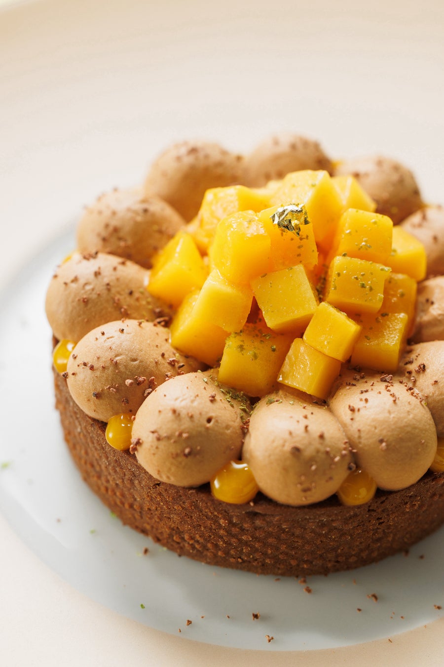 優しいくちどけのマスカルポーネクリーム、ふわふわのショコラビスキュイ、ジューシーなマンゴーとライムのジュレが層になった爽やかなフルーツと風味豊かなショコラのティラミス。トップにはふんわりとしたクリームを盛り付け、上からショコラカフェソースをかけてお楽しみいただきます。