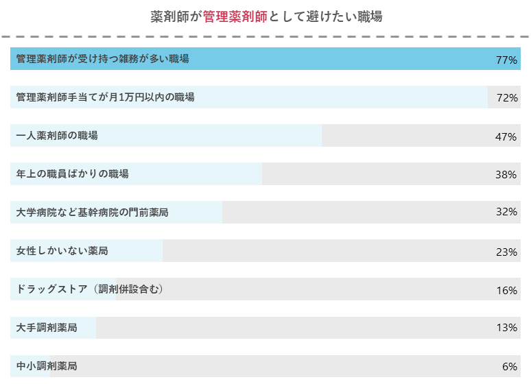 - 薬剤師が管理薬剤師として避けたい職場の最多は、「管理薬剤師が受け持つ雑務が多い職場」が77%