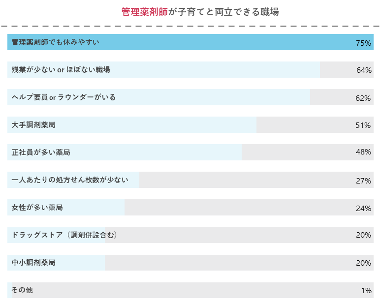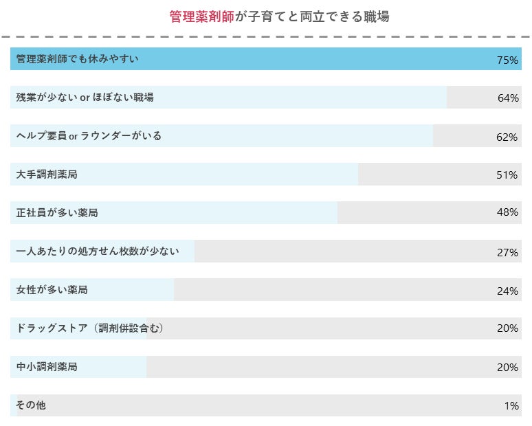 - 管理薬剤師が子育てと両立できる職場の最多は、「管理薬剤師でも休みやすい」で75%