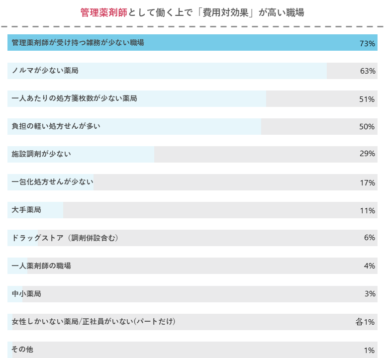 - 管理薬剤師として働く上で「費用対効果」が高いと感じる職場の最多は、「管理薬剤師が受け持つ雑務が少ない職場」が73%
