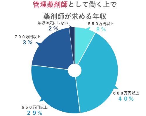 - 管理薬剤師として働く上で、薬剤師が求める年収の最多は「600万円以上」が40%