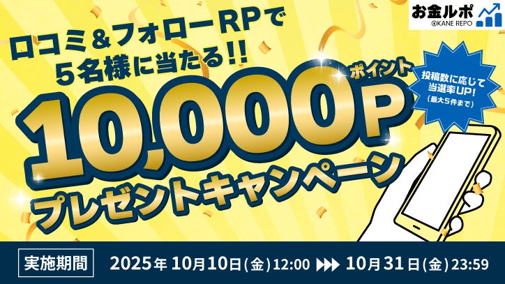 サクラサクマーケティング株式会社(本社:東京都渋谷区渋谷、根岸雅之)が運営する金融情報サイト「お金ルポ」は、抽選で5名様に10,000円相当ポイントが当たるキャンペーンを開始しました。