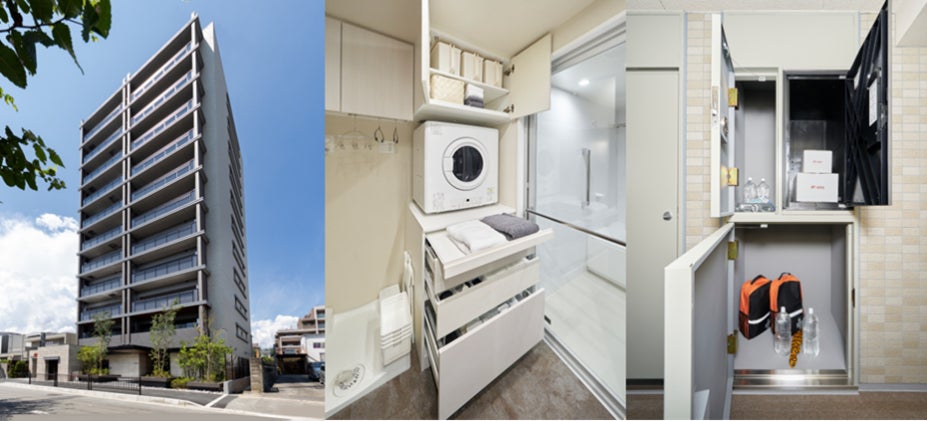 「ラク家事」「置き配」「レジリエンス」といったキーワードをもとに新しいライフスタイル『たかつきMe:LIFE(ミライフ)』を提案。ガス衣類乾燥機『乾太くん』全戸標準設置(関西初)、各住戸の玄関前に「専用宅配ボックス」「専用防災備蓄倉庫」を設置。
