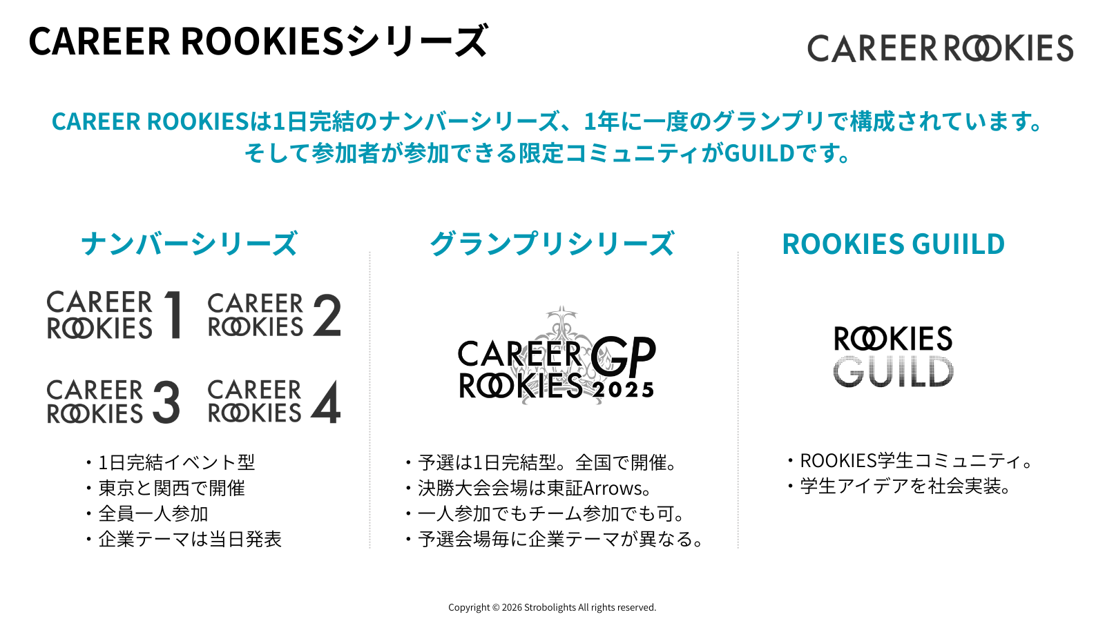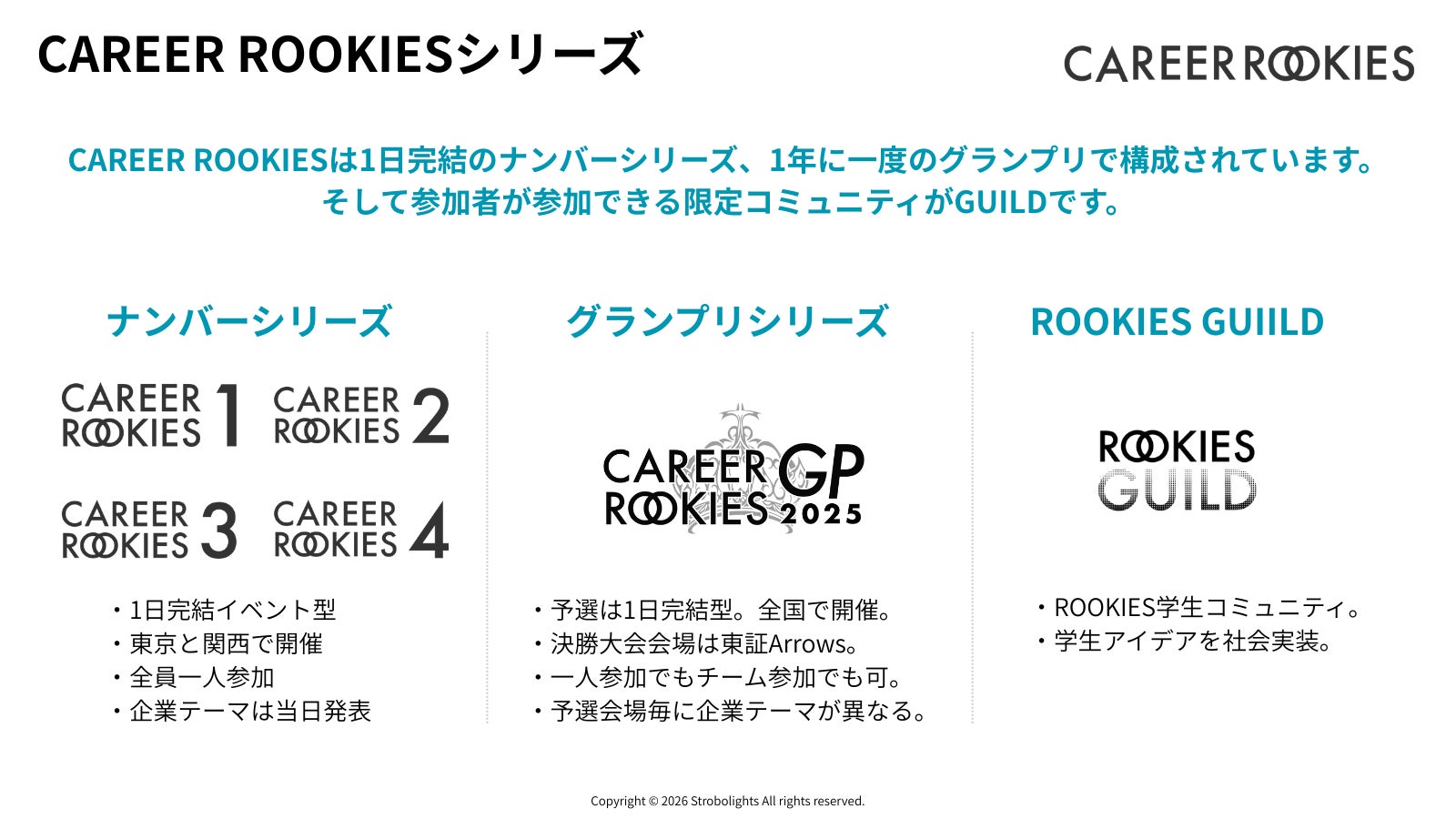 株式会社Strobolights(本社:東京都町田市、代表取締役社長:羽田啓一郎)は、学年不問の大学生ビジネスコンテスト「CAREER ROOKIES(キャリアルーキーズ)」に参加した大学生を中心とした実践型コミュニティ、「ROOKIES GUILD(ルーキーズ ギルド)」を立ち上げました。