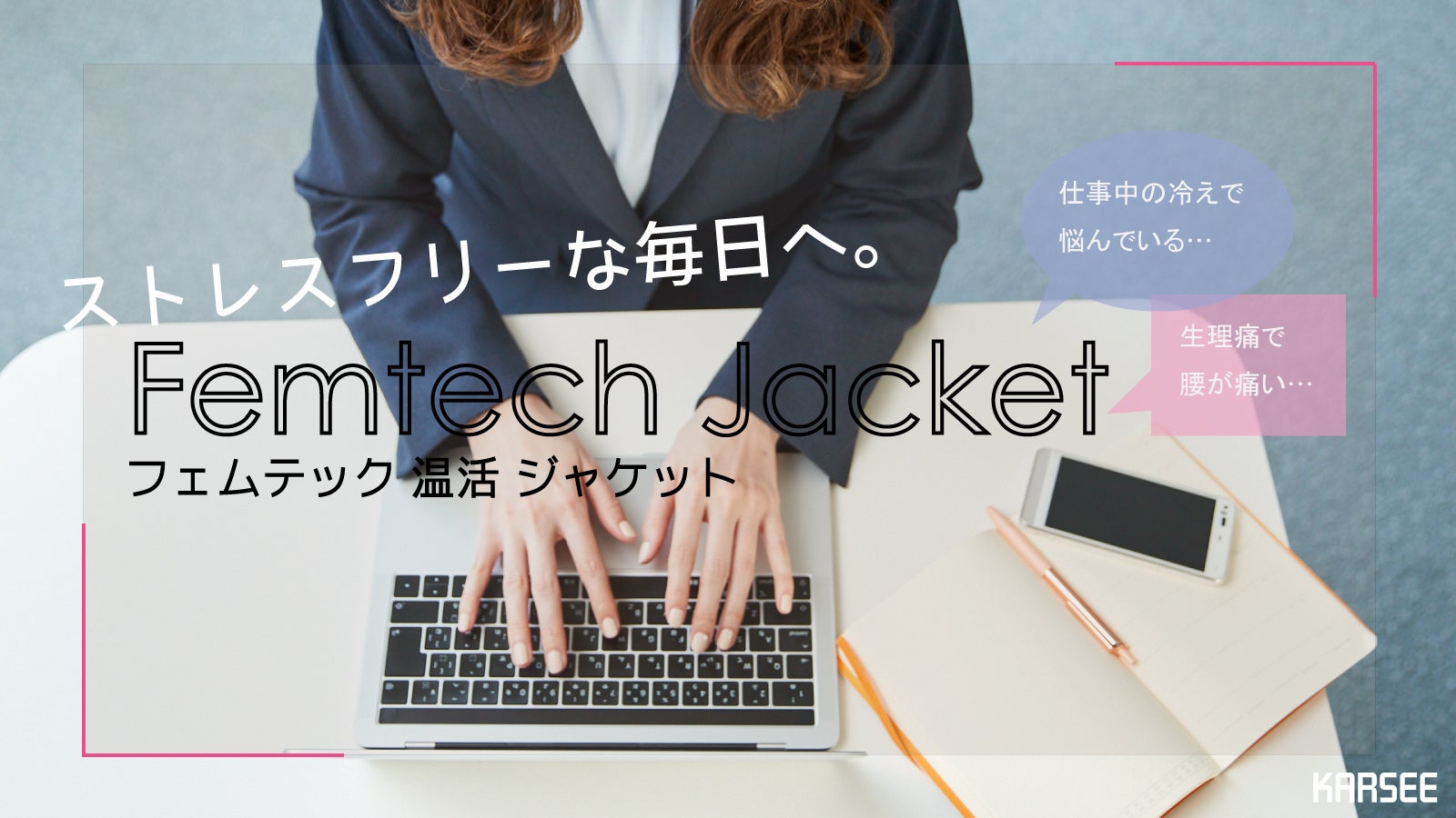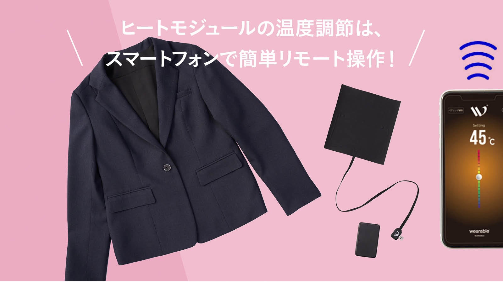 『フェムテック 温活 スーツ』は、"ヒートモジュール"と呼ばれる温かくなるデバイスをジャケットやベストに入れることで、腰や背中を温かくすることができるアイテム。Bluetoothでスマートフォンの専用アプリと連動し、温度調節が可能。カイロ代わりになり、身体にもお財布にも環境にも優しい商品です。