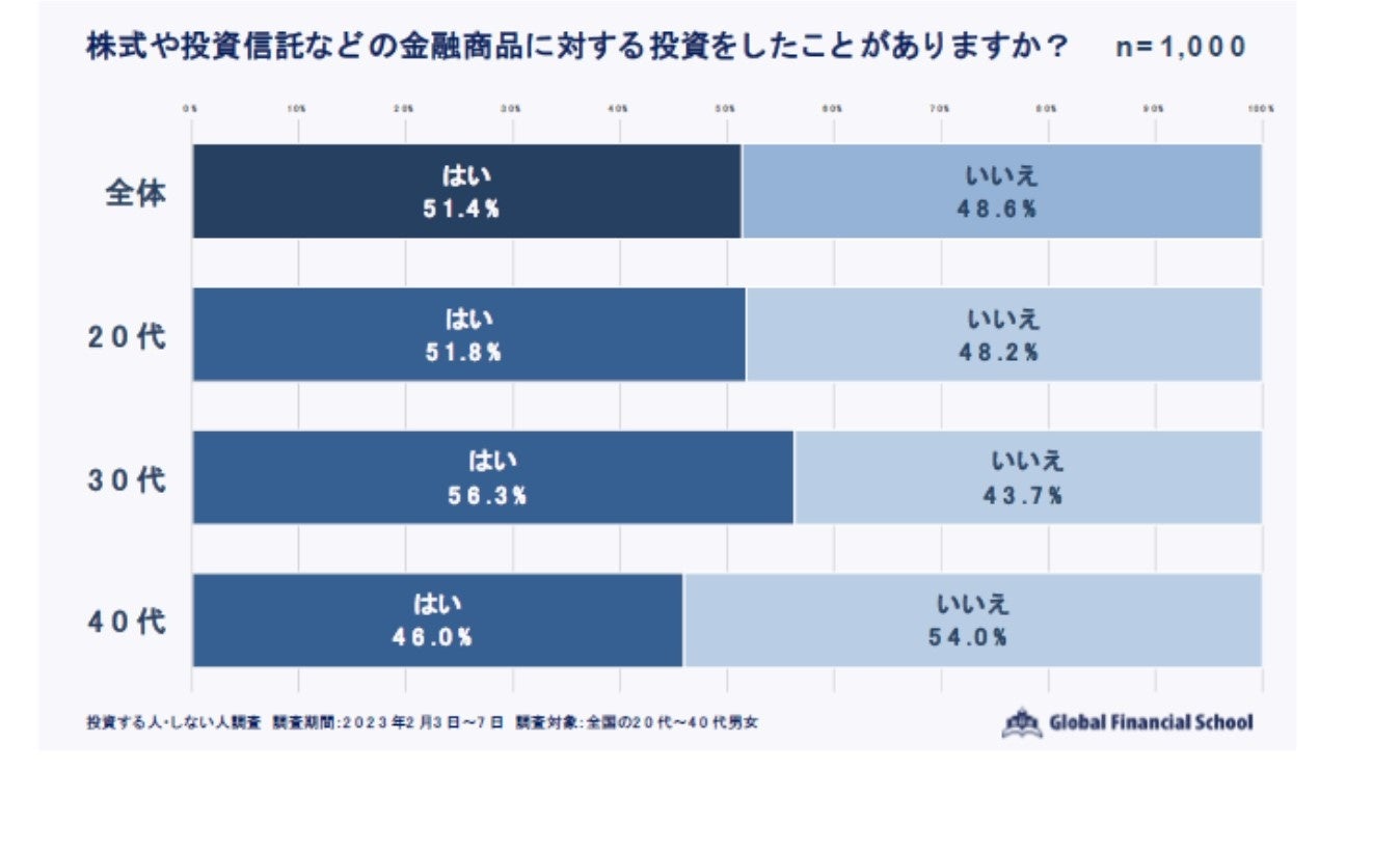 ・全国20〜40代の男女1,000人の投資経験は「あり」51.4% 「なし」48.6% と半々に |