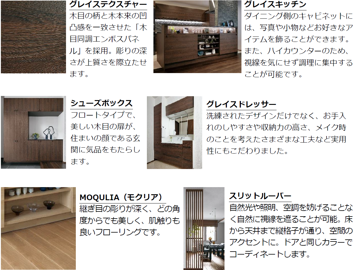 木目の柄と木本来の凹凸感を一致させた高品質な「グレイステクスチャー」をキッチン、シューズボックス、ドレッサーなどに採用。高い収納力や、使いやすさなど実用性にこだわりながら、洗練された気品ある美しさを実現しています。その他、自然感あふれるフローリングやお部屋のアクセントとなるアイテムなどもご用意しています。カラーは好みのインテリアコーディネートに合わせ、4色からお選びいただけます。