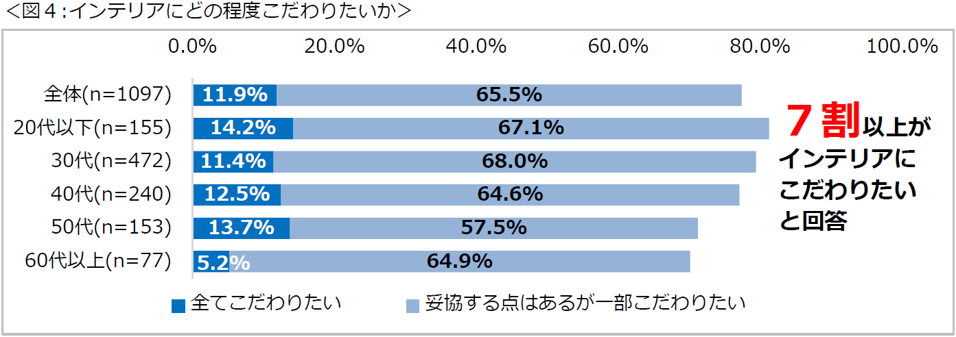 続いて、「インテリアにどの程度こだわりたいですか」と尋ねたところ、全体の7割以上の人が、全て、または、一部インテリアにこだわりたいと思っていることが分かりました。最もこだわりたい人が多かった20代以下の世代では、14.2%が「全てこだわりたい」、67.1%が「妥協する点はあるが一部こだわりたい」と回答し、8割以上の人がインテリアにこだわりたいと考えていることが分かりました。また、50代では、20代以下の次に「全てこだわりたい」と回答した人が多く見られました(図4)。