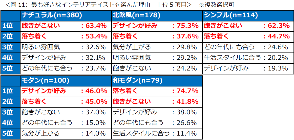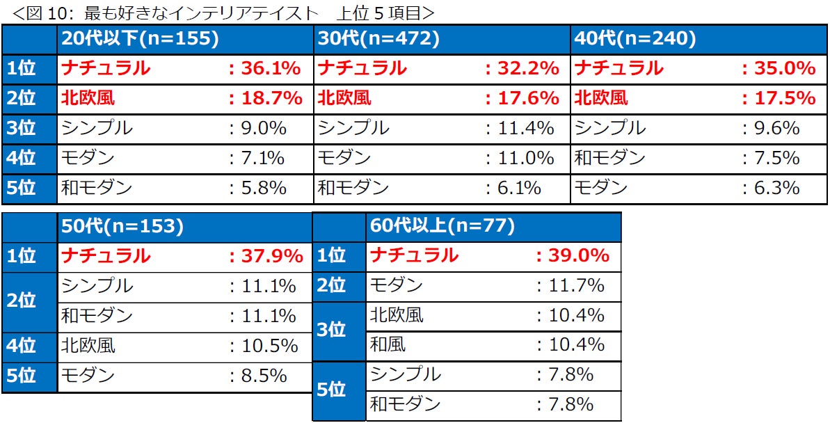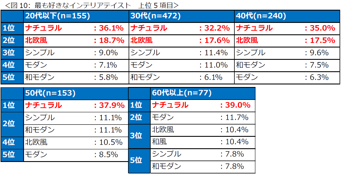 最も好きなインテリアテイストは、全年代で「ナチュラル」が1位。