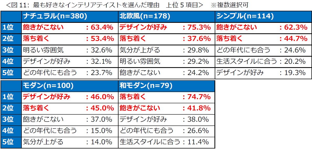 「最も好きなインテリアテイストはどれですか」という質問に17種類のインテリアテイスト※から選んでもらったところ、全年代で「ナチュラル」が1位に選ばれました。2位~5位は、順位が異なるものの全年代で「北欧風」「シンプル」「モダン」「和モダン」がランクイン。40代以下の世代では、「北欧風」が2番目に人気でした。また、50代では、シンプルと和モダンが同率2位、60代以上では北欧風と和風が同率3位、シンプルと和モダンが同率5位でした(図10)。