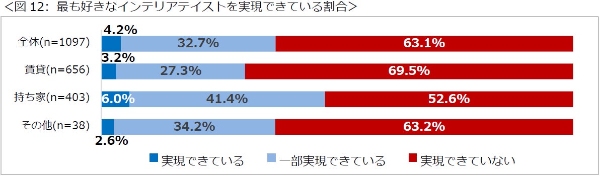「最も好きなインテリアテイストを実現できていますか」と尋ねたところ、「実現できている」と回答したのは4.2%でした。「実現できていない」と感じている人が最も多く、全体の6割以上いることが分かりました。賃貸では約7割、持ち家でも5割以上の人が実現できておらず、理想と現実にギャップがあることが判明しました(図12)。
