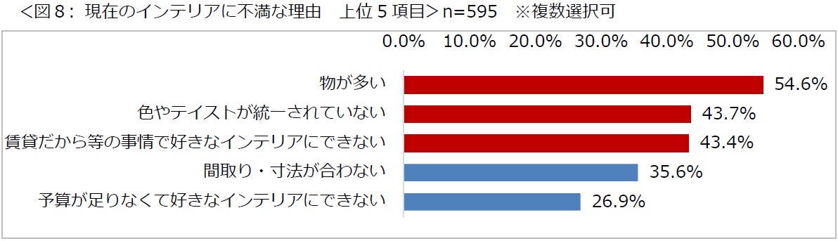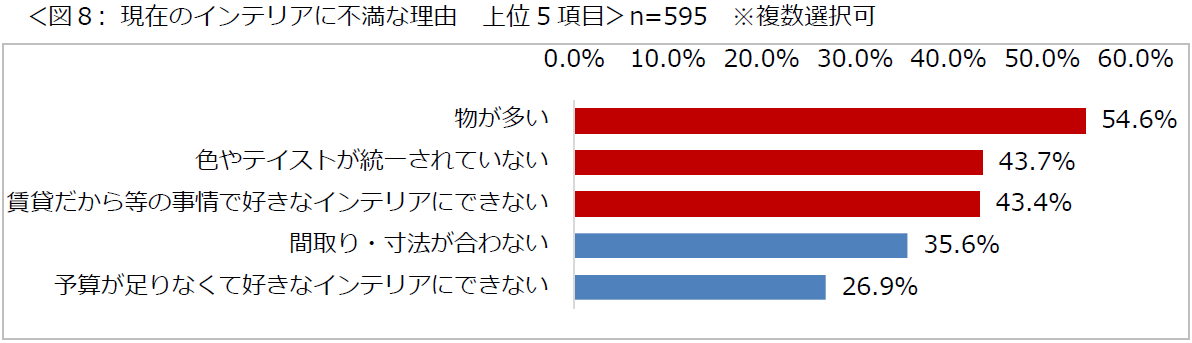 ■半数以上が現在のインテリアに不満あり。不満の理由1位は「物が多い」。
