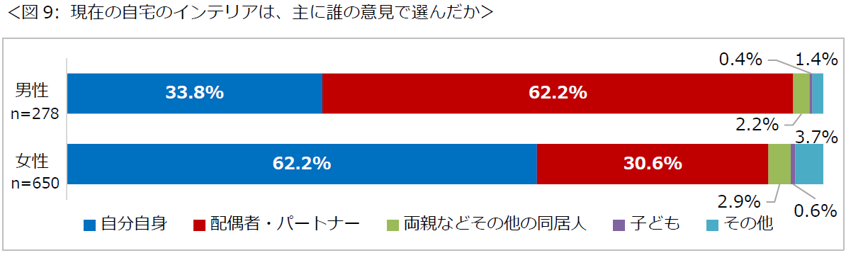 回答者のうち、配偶者・パートナーと同居をしている男女に、「現在の自宅のインテリアは、主に誰の意見で選びましたか」と尋ねたところ、「自分自身」と回答した女性が62.2%だったのに対し、男性では33.8%でした。また、男性の62.2%が「配偶者・パートナー」と回答しました(図9)。