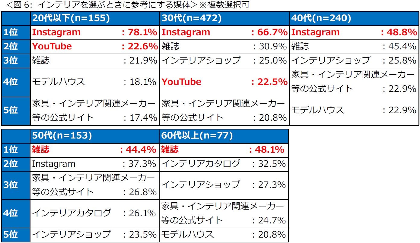 続いて、「インテリアを選ぶときに参考にするのはどれですか」と尋ねたところ、「Instagram」が40代以下の全年代で1位となり、若い人ほど「Instagram」を活用している割合が高いことが分かりました。また、20代と30代の2割以上が「YouTube」と回答しており、20代では圧倒的1位の「Instagram」に次いで「YouTube」が2位でした。一方、40代以降になると「雑誌」を参考にする人が4割を超え、50代以降では「雑誌」を参考にする人が最も多いことが分かりました(図6)。