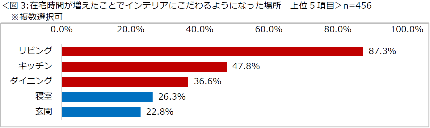 コロナ禍で在宅時間が増えた人のうち、6割以上がインテリアにこだわるようになったことが判明。9割近くの人が「リビング」をこだわるようになったと回答。