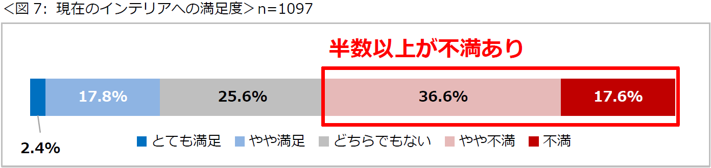 半数以上が現在のインテリアに不満あり。満足しているのは2割以下。