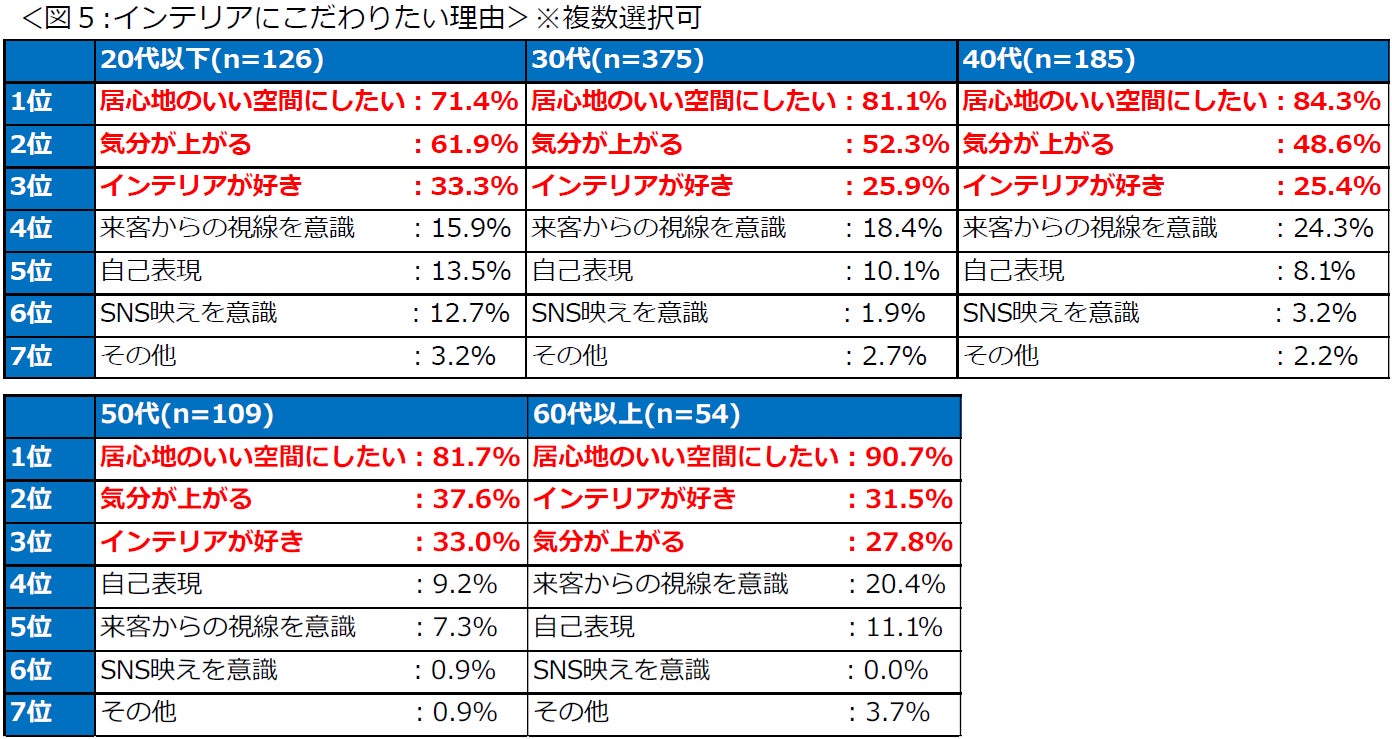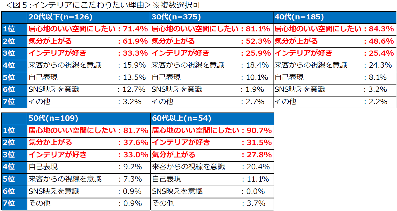 「インテリアにどの程度こだわりたいですか」という質問に「全てこだわりたい」「妥協する点はあるが一部こだわりたい」と回答した人に、こだわりたい理由を尋ね、複数選択で回答してもらったところ、全年代で「居心地のいい空間にしたい」がトップでした。また2位・3位には「気分が上がる」「インテリアが好き」が並び、「来客からの視線を意識」「SNS映えを意識」といった他の人からの見られ方よりも、自分自身の満足や好みを求めてインテリアにこだわる人が多いことが分かりました(図5)。