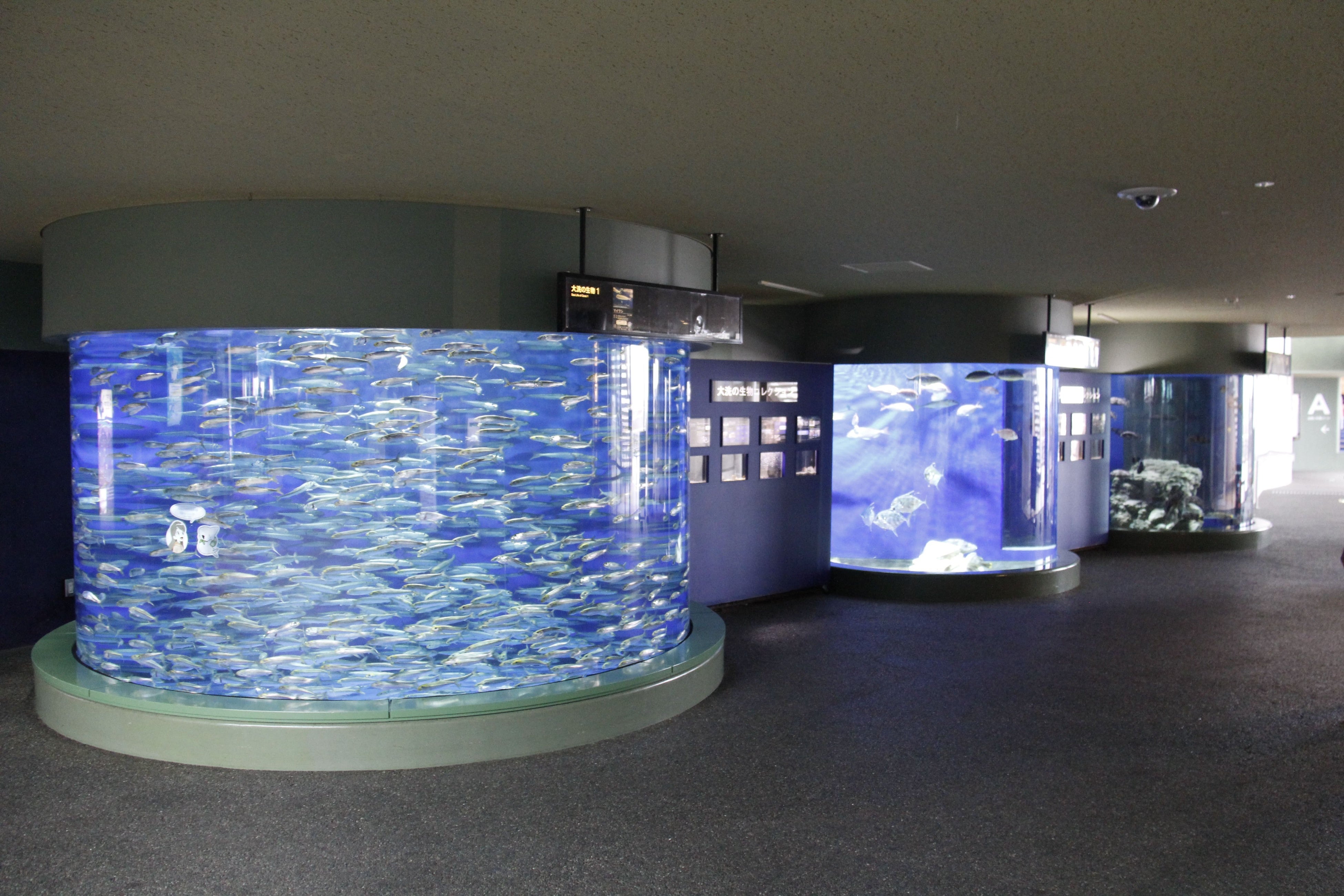 「大洗の生物1」水槽『南方からの旅』:タカベの群れ