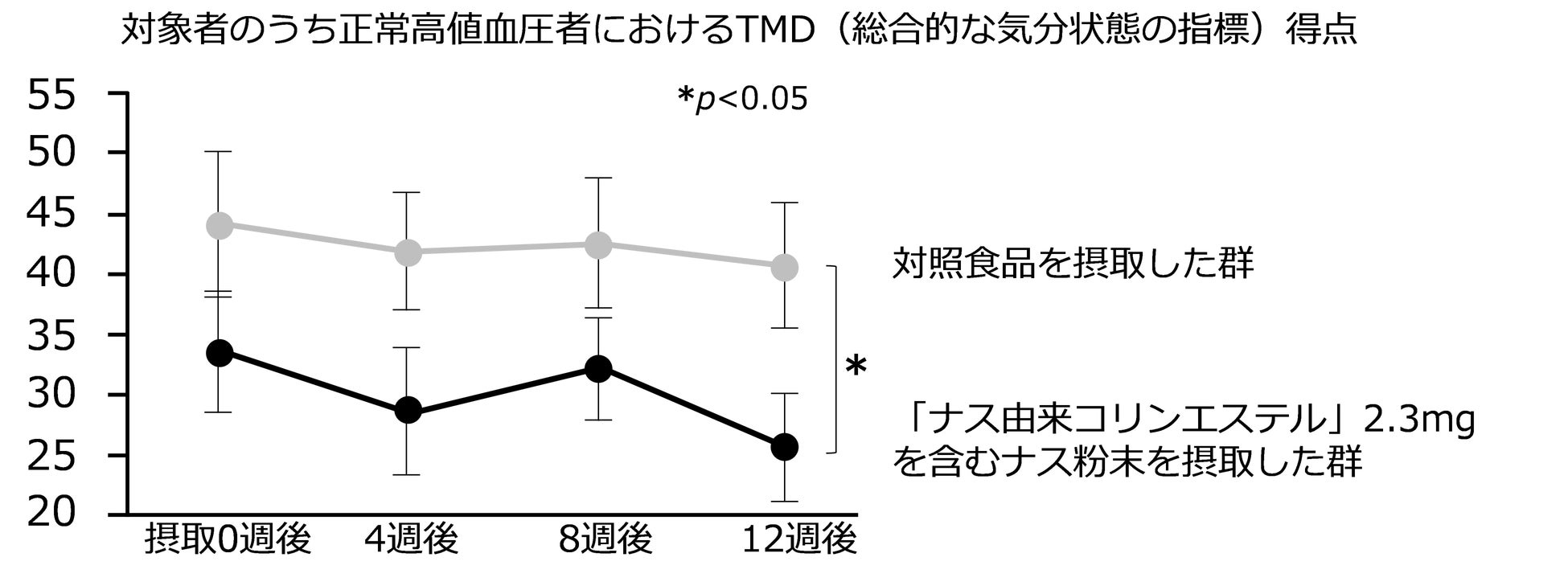 ナス由来コリンエステルを2.3 mg 含有するナス粉末を12 週間継続摂取することで、ストレスを感じている正常高値血圧者およびⅠ度高血圧者の血圧および心理状態が有意に改善することを、プラセボ対照ランダム化二重盲検並行群間比較試験で実証し、ヒトにおけるナスの食品機能性を世界で初めて明らかにしました。12 週間の摂取期間中、副作用や問題となる有害事象は認められずナス粉末の安全性も確認されています。対象者全体(正常高値血圧者およびⅠ度高血圧者)において、8週間の摂取で来所時血圧(拡張期)が有意に改善し、この効果は正常高値血圧者で顕著でした(図1)。正常高値血圧者において、12 週間の摂取でTMD (Total Mood Disturbance:総合的な気分状態の指標)得点※6が有意に改善しました(図2)。本研究は国際学術誌Nutrients(2022年インパクトファクター:5.9)に掲載されています。※7本研究はナス高機能化プロジェクト※3で実施されました。