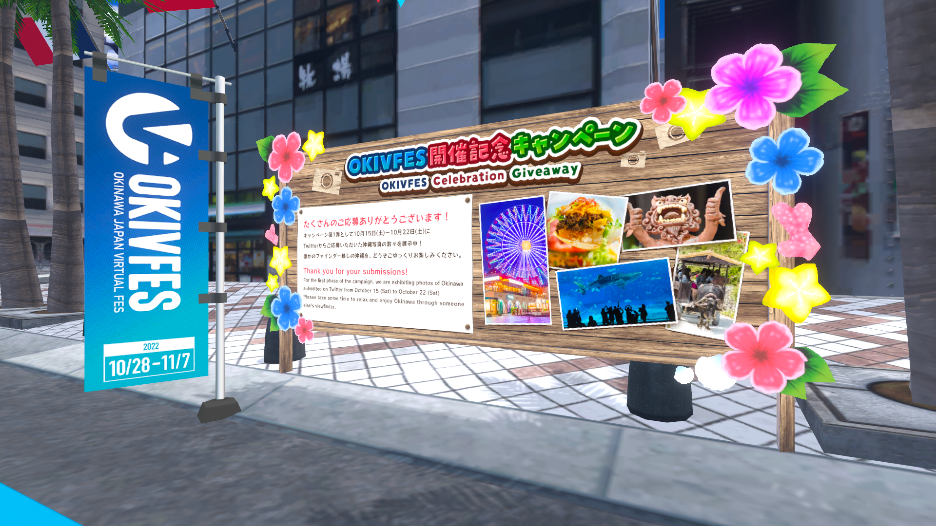 OKIVFES開催期間中は、バーチャル沖縄の国際通りワールドに投稿写真の展示スペースが出現!あなたの思い出の1枚がメタバース空間に展示されるかも知れません。