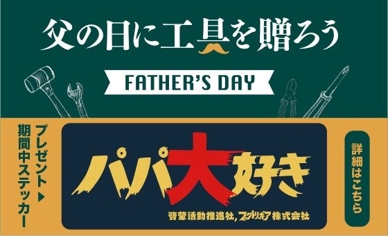 父の日企画。工具ショップが、お父さんへの愛のメッセージ活動を応援します。【パパ大好き】ステッカーを店頭配布。