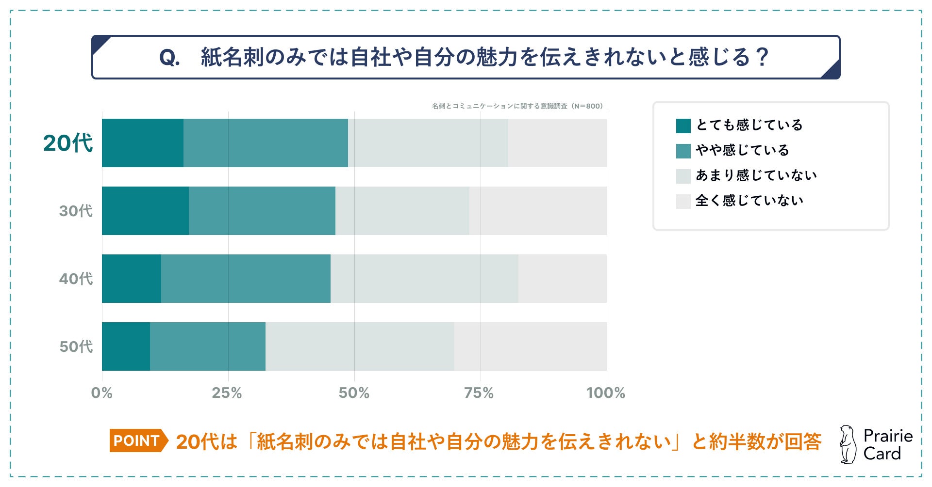 紙名刺のみでは自社や自分の魅力を伝えきれないと感じるかを尋ねたところ、20代では「とても感じている」(16.3%)、「やや感じている」(32.7%)と約半数が魅力を伝えきれていないと回答しました。