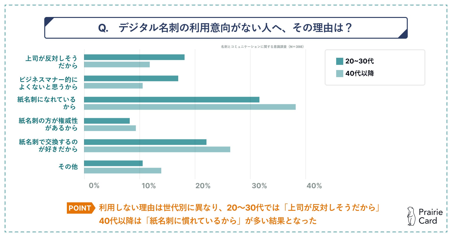 デジタル名刺の利用意向がない人に理由を尋ねたところ、「紙名刺で管理することに慣れているから」(35.4%)「紙名刺で交換するのが好きだから」(24.3%)「上司が反対しそうだから」(14.5%)となり、世代ごとに利用のハードルがあることが分かりました。
