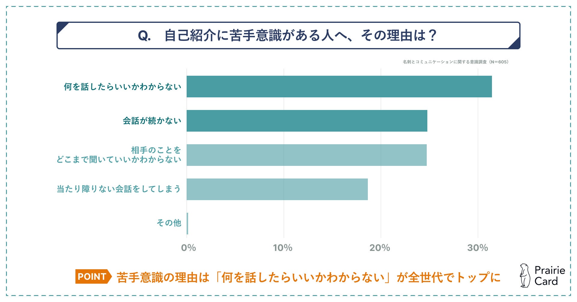 自己紹介に苦手意識がある人に苦手だと感じる理由を尋ねたところ、「何を話したらいいかわからない」が全世代でトップに。