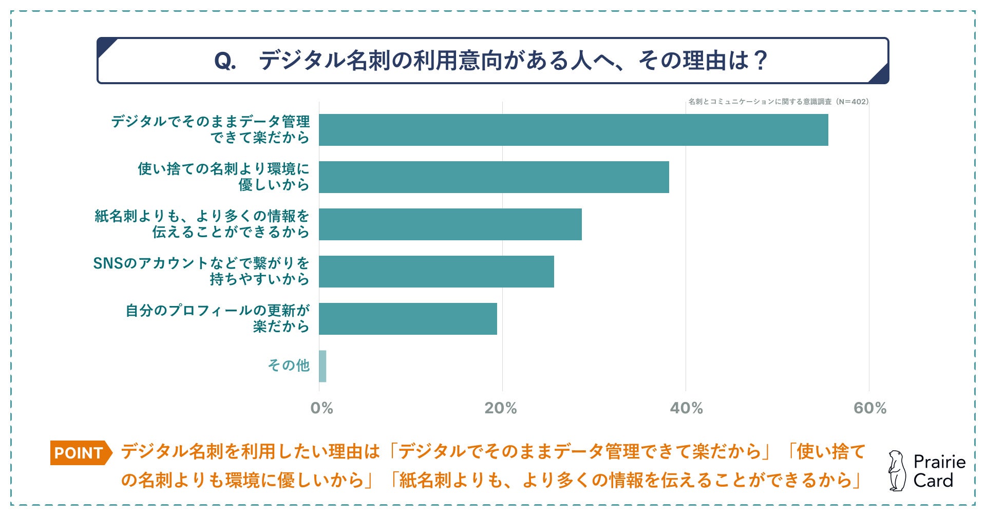 デジタル名刺の利用意向がある人に理由を尋ねたところ、「デジタルでそのままデータ管理できて楽だから」(55.4%)、「使い捨ての名刺よりも環境に優しいから」(38.0%)、「紙名刺よりも、より多くの情報を伝えることができるから」(28.6%)と、昨年に引き続き管理の楽さと環境への優しさ、そしてより多くの情報を伝えられることだと捉えられています。