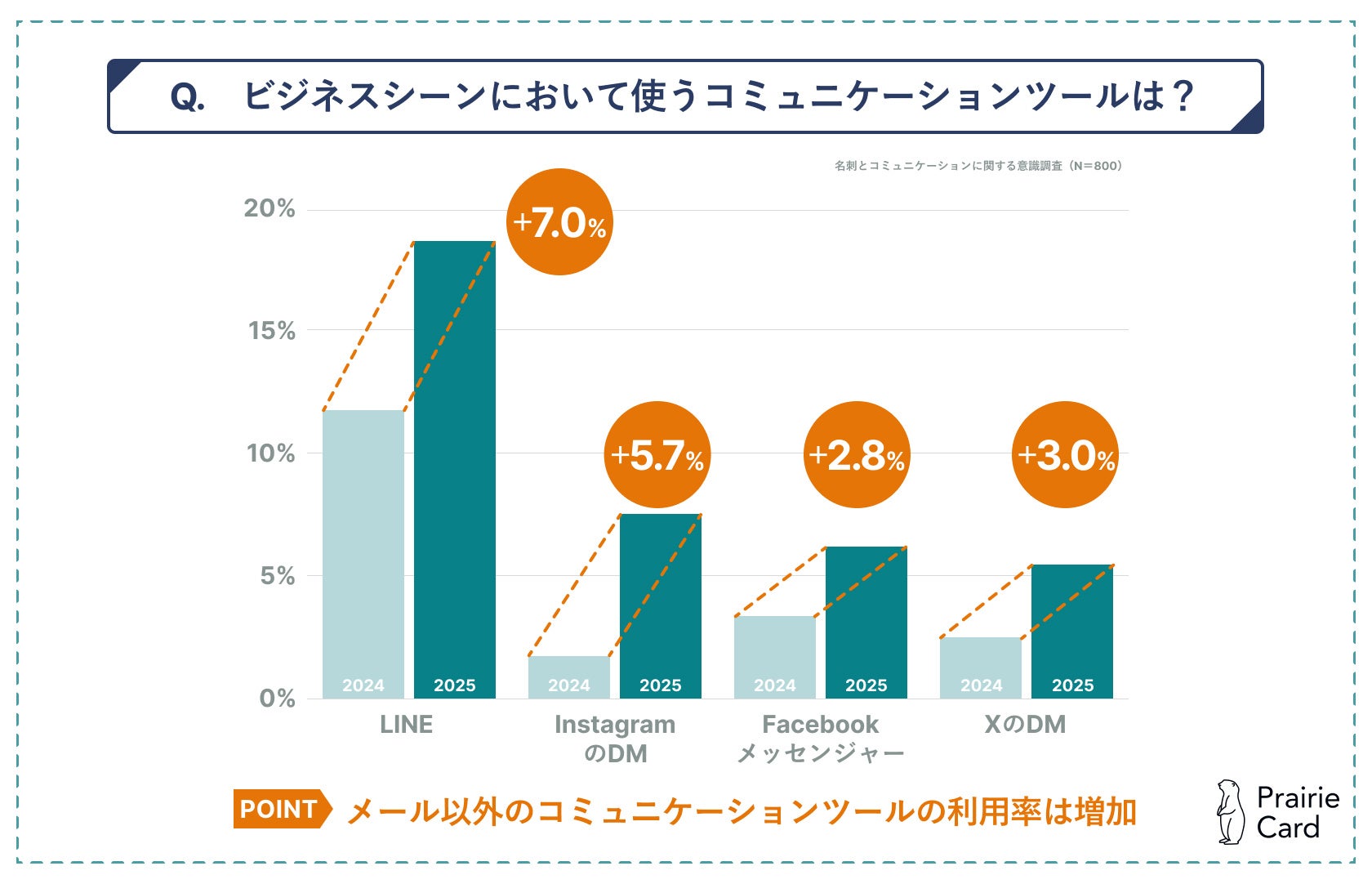 昨年と比較すると、LINE7.0%増、InstagramのDM5.7%増、XのDM3.0%増、Facebookメッセンジャーは2.8%増となし、それに対して、メールは18.2%減でした。