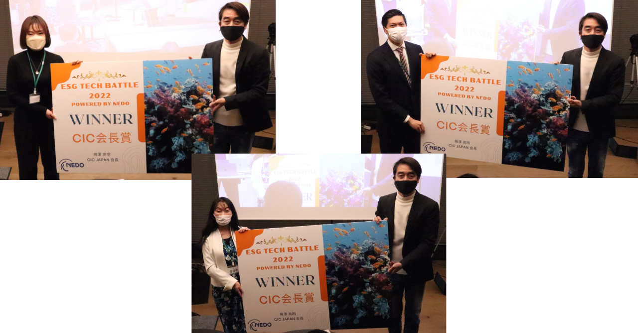CIC Tokyoは国立研究開発法人 新エネルギー・産業技術総合開発機構(以下「NEDO」という。)と連携し、ESG領域の研究開発型スタートアップや研究者を対象としたピッチコンテスト(賞金100万円)を3月18日(金)にCIC Tokyo&オンラインで開催しました。現地には約70名の来場者と、オンラインでは当日だけで500近い視聴があり、大変盛り上がる会となりました。最優秀賞として経済産業省産業技術環境局長賞が1組、優秀賞としてNEDO賞が3組、そして入賞者としてCIC Tokyo会長賞が3組のスタートアップ&研究者に贈られました。