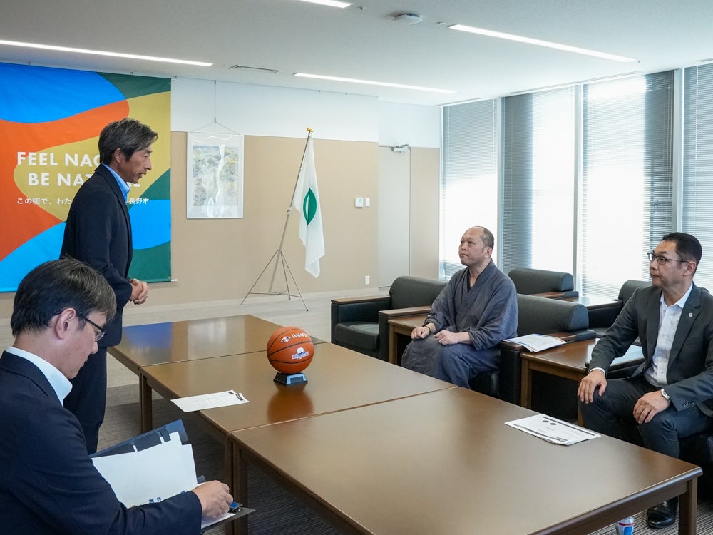 市長表敬訪問に伴うバスケットボール寄贈式は長野市役所にて執り行い、