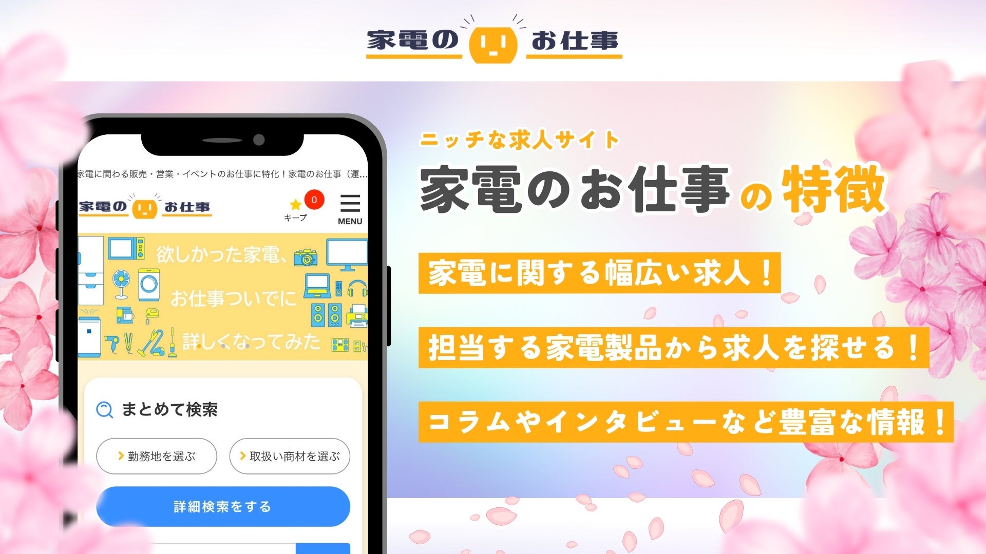 「家電のお仕事」は、総合求人サイトでは「販売職」という大きなカテゴリでしか表示されなかった家電の販売職を、さらにニッチな「担当する商品カテゴリ」から探すことができます。専門スキルを持った経験者にとっては必要な求人情報だけをピンポイントで見つけることができ、未経験者にとっては「好きなモノ」という切り口から自分に合った求人情報を得ることができるのが最大の特長です。カテゴリ別の検索性を高めることで、求職者の希望条件に合う情報を的確にマッチングさせる仕組みを整えています。