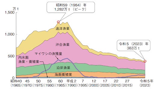 日本の漁業・養殖業の生産量は1980年代の3分の1以下まで落ち込み、沿岸漁業だけでも6割以上が減少しています。そのため市場に流通する魚は激減し、価格も他の食材に比べて極端に高騰しています。飲食店にとっても、魚を安定的に仕入れ、提供すること自体が難しくなりつつあるのが現状です。