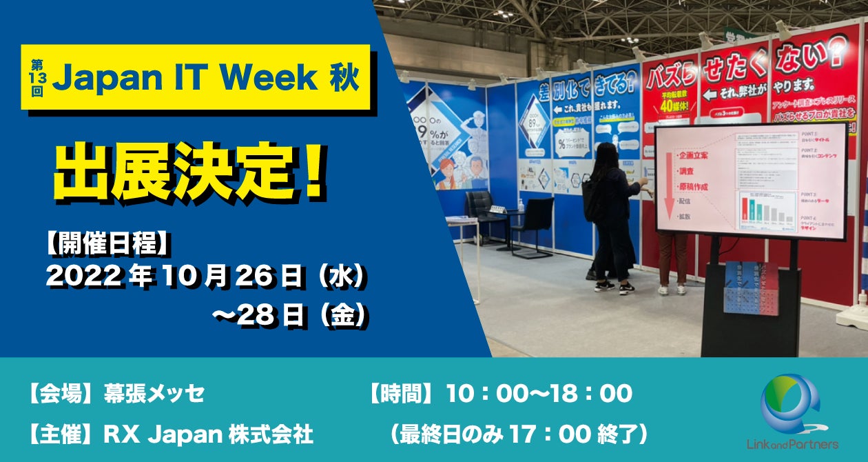 株式会社リンクアンドパートナーズ(本社:東京都渋谷区、代表取締役:宮野 慶)は、2022年10月26日(水)〜2022年10月28日(金)に幕張メッセ(所在地:千葉県美浜区)で開催される【第13回Japan IT Week「秋」】内の「Web&デジタル マーケティングEXPO」に出展いたします。