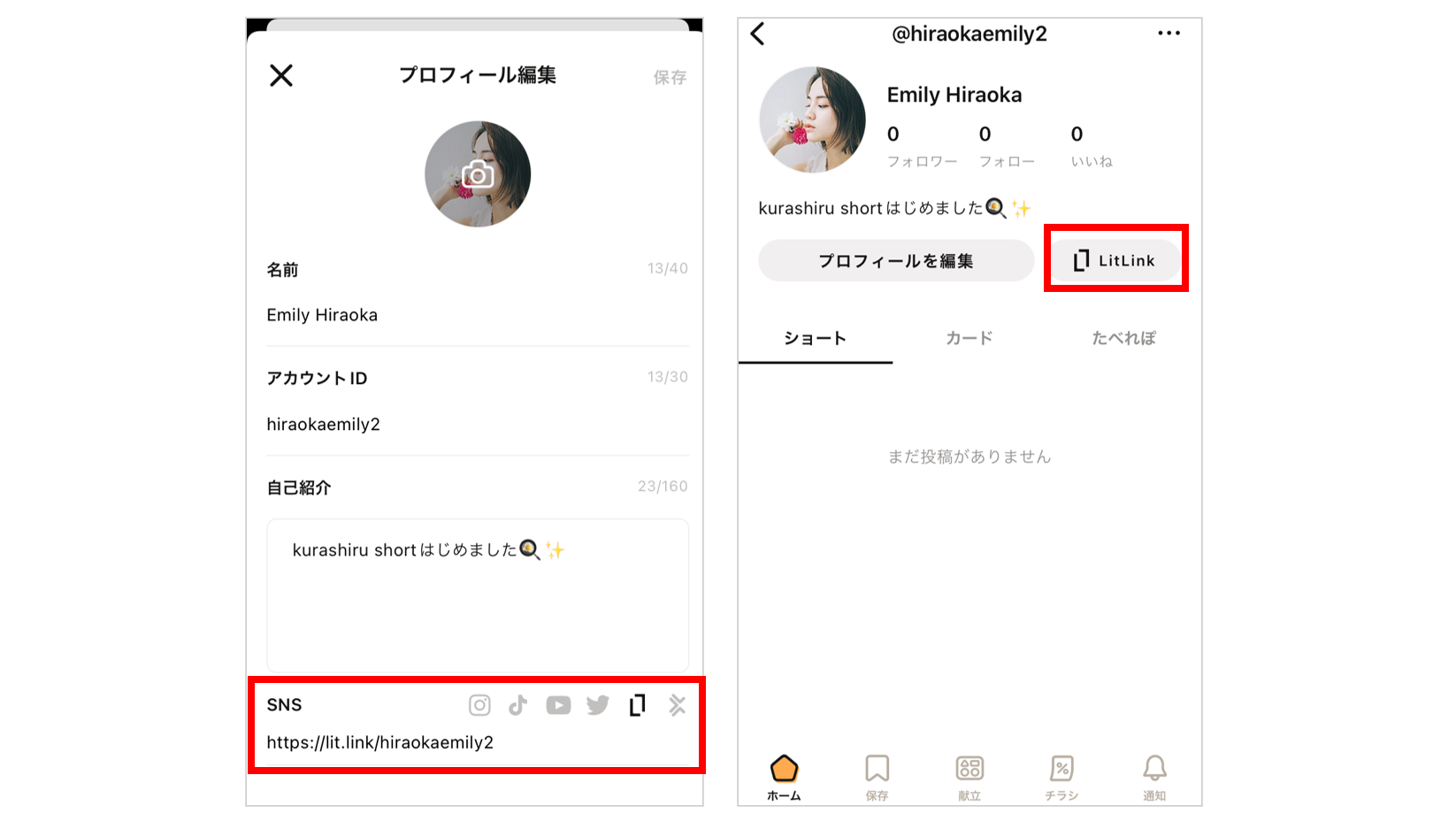 ①kurashiru shortsのプロフィールページにlit.linkが連携