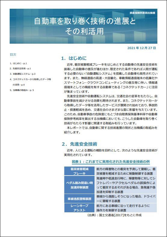 本レポートでは、先進安全技術や自動運転システム、コネクテッドカーから取得したデータを活用したサービスの現状を紹介するほか、こうしたそれぞれの技術進展に対する当機構の取組みも紹介しています。