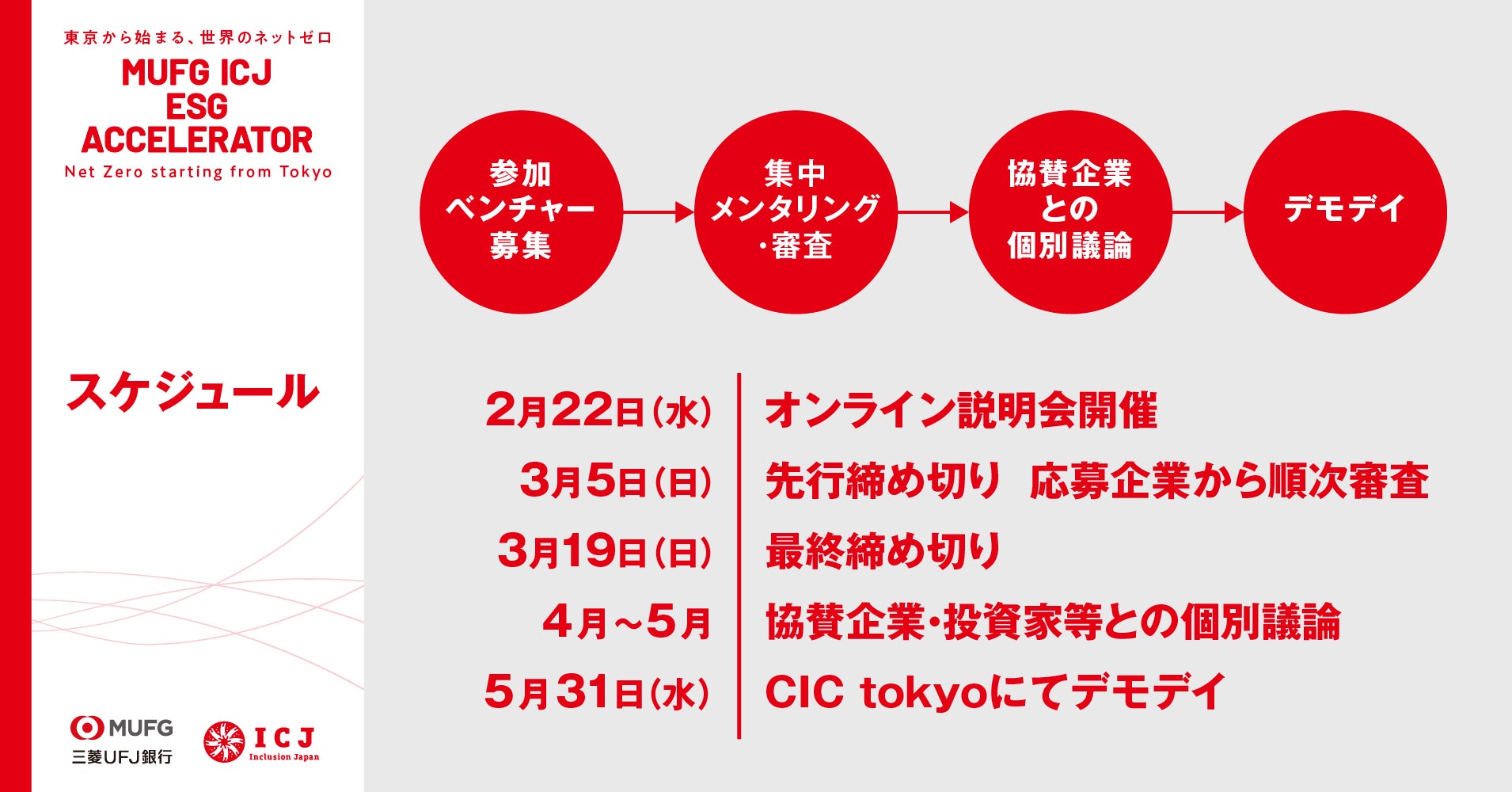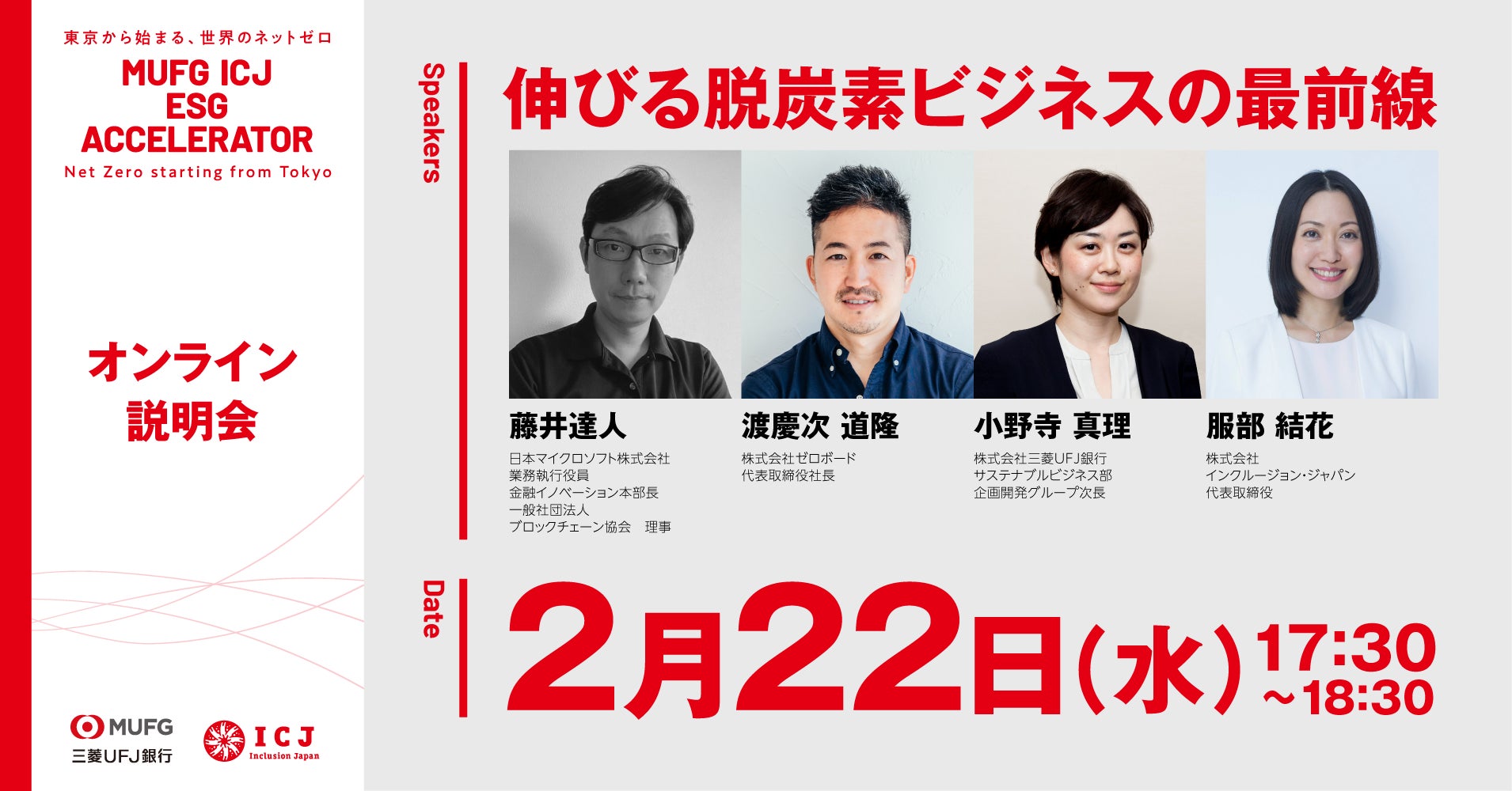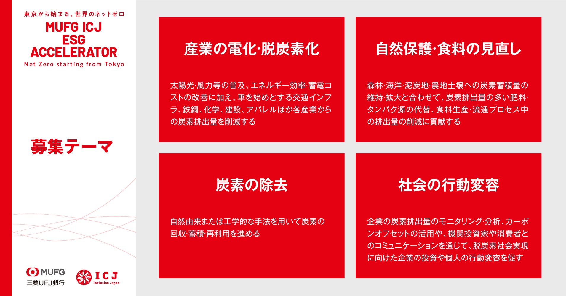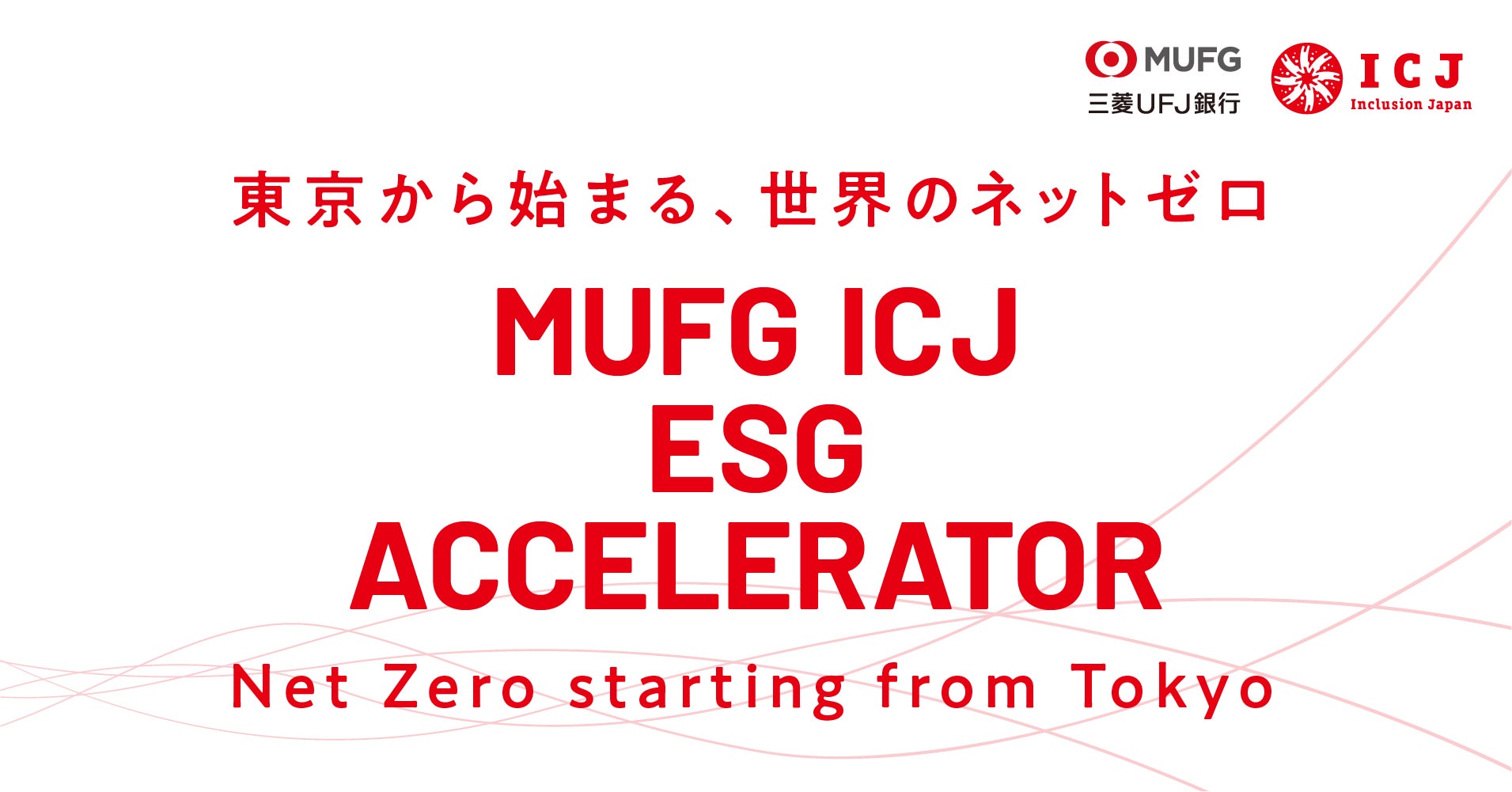 株式会社三菱UFJ銀行(本社:東京都千代田区、取締役頭取執行役員:半沢淳一、以下 三菱UFJ銀行)は、ESG・脱炭素領域においてベンチャー投資を行うインクルージョン・ジャパン株式会社(本社:東京都品川区、代表取締役:服部結花、以下 インクルージョン・ジャパン)とともに、世界の温室効果ガス排出量実質ゼロ(ネットゼロ)を目指す投資家、事業会社、ベンチャー企業が集う「MUFG ICJ ESGアクセラレーター 2023」(以下 本プログラム)を開催します。