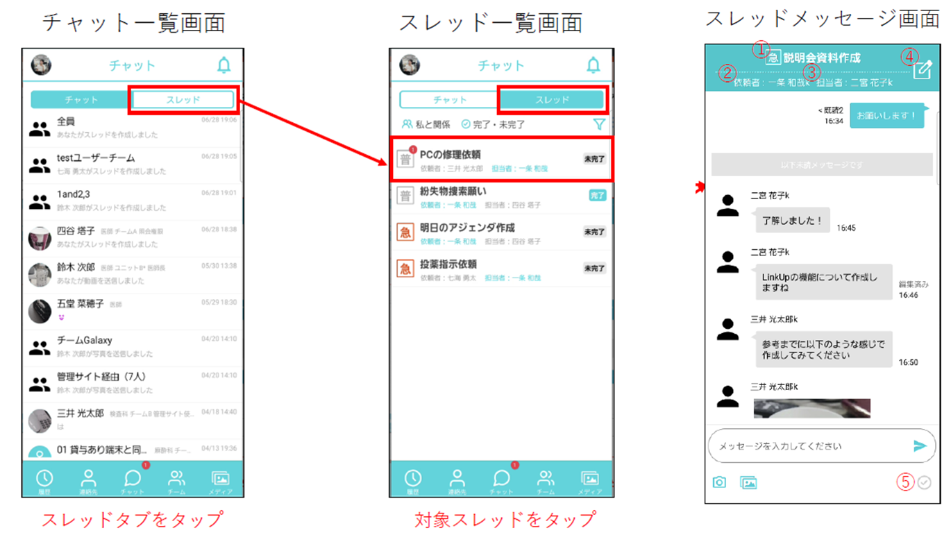 例えば、「パソコン修理依頼」という題名でチャットルームを作成し、依頼者/担当者/目的の状態(完了・未完了)が確認できます。これにより、チャットが上から下へ流れてしまうことで、誰からいつ修理依頼を受けたか行方不明になってしまう事象を解決できます。