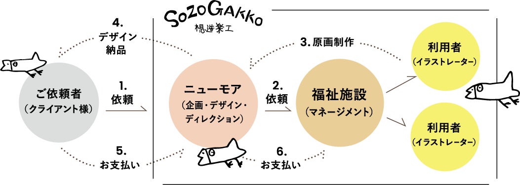 福祉施設と連携し、障害のある方々をイラストレーターとして迎え、支援対象ではなくパートナーとして、制作に対し正当な費用が渡る仕組みを設定しています。