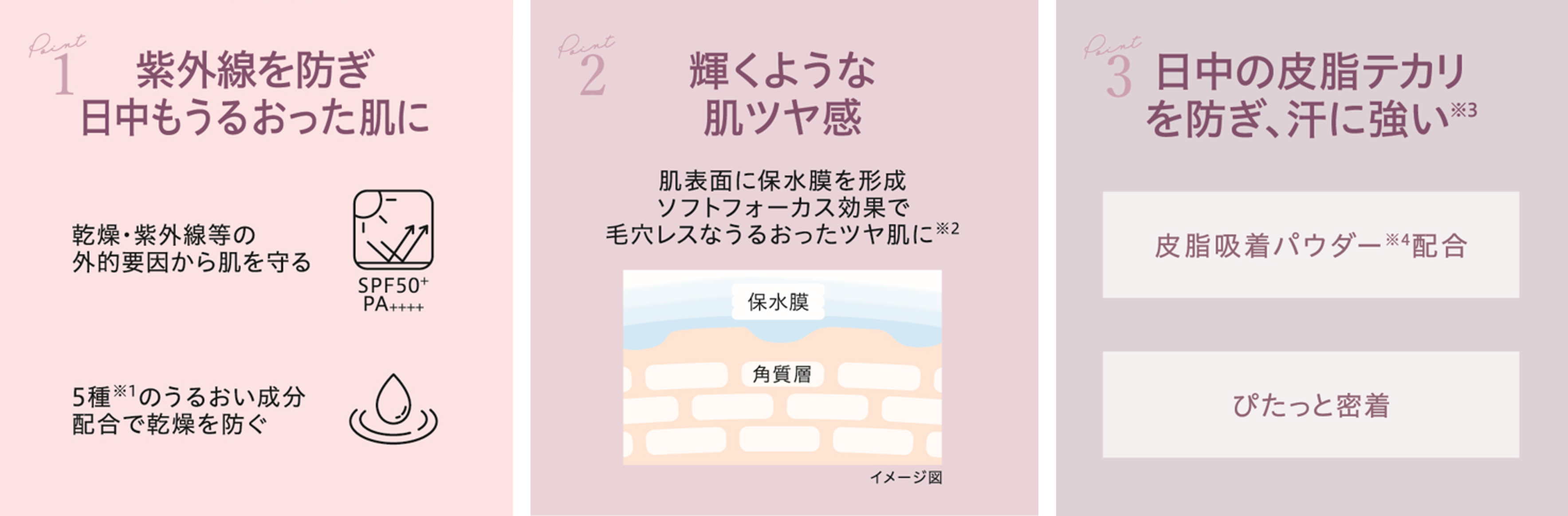 ※1被膜効果によりちり、ほこり・ PM2.5の肌への付着を防ぎ紫外線を防ぐこと※2メイクアップ効果による※3被膜効果によりほこり、PM2.5の肌への付着を防ぎながら紫外線を防ぐこと※4ほこり、PM2.5※5植物性スクワラン ・ オリブ油 ・ ホホバ油 ・ マカデミアナッツ油 ・ ローズヒップ油 ・ ヒアルロン酸ナトリウム(2) ・ アンズ果汁※6メイクアップの耐久性のこと※7ヒドロキシアパタイト (粉体基剤)