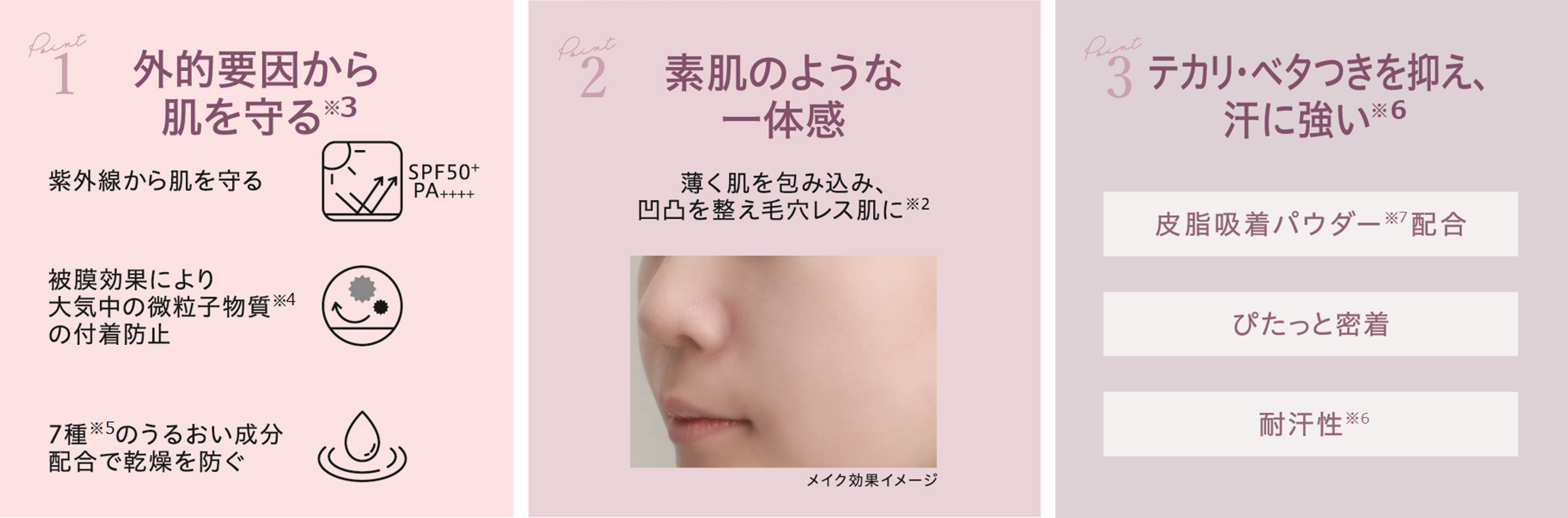 仕上がり、香り、パッケージデザイン、ロゴ全てにこだわり、有効成分を配合することで肌悩みに対応しながら毎日のメイクを楽しんでいただけます。