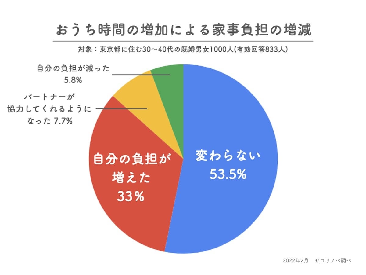 「変わらない」と答えたのは53.5%、ついで「自分の家事負担が増えた」と答えたのが33.0%。「自分の負担が多かったがパートナーが協力してくれるようになった」と答えたのは7.7%にとどまる。