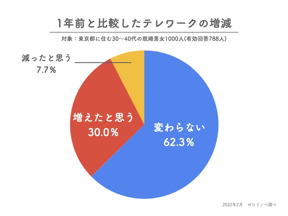 1年前と比較したテレワークの増減を聞いたところ以下の結果となりました。